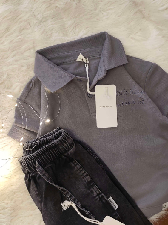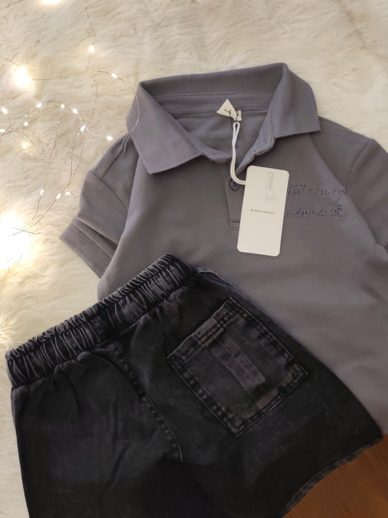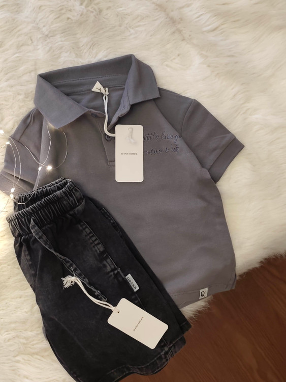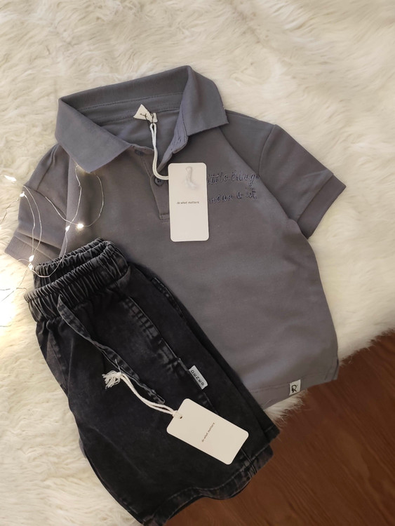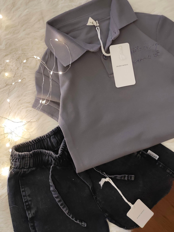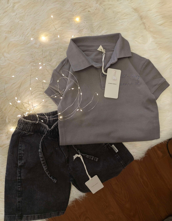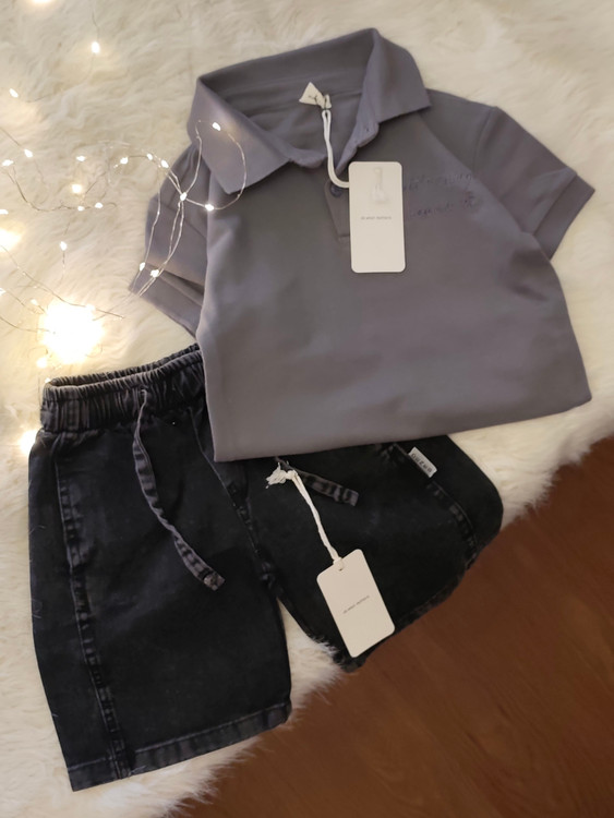 تیشرت یقه دار جودون نخ پنبه بهمراه شلوارک لی زغالی کمر کش جیب میخوره