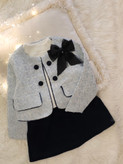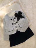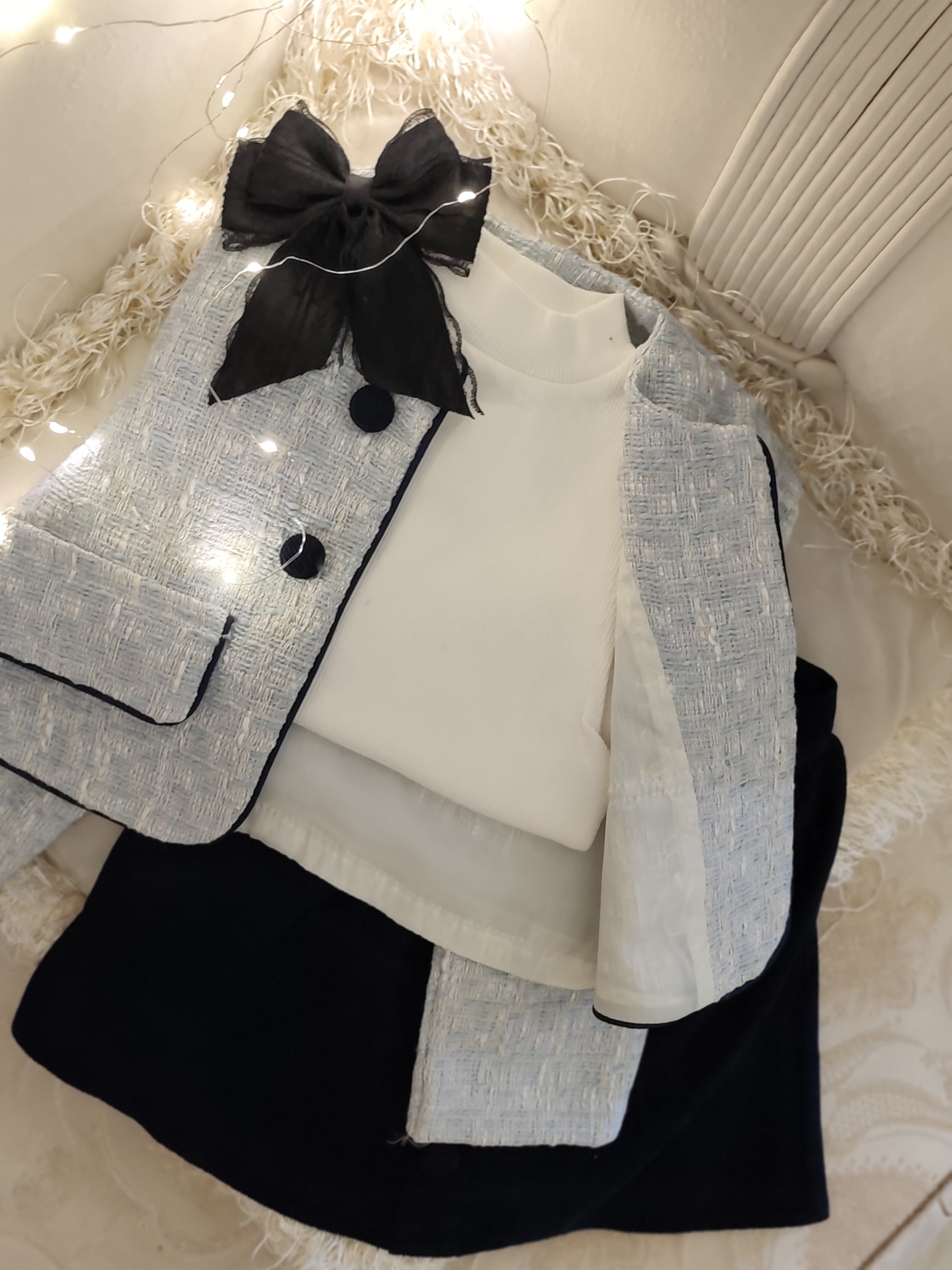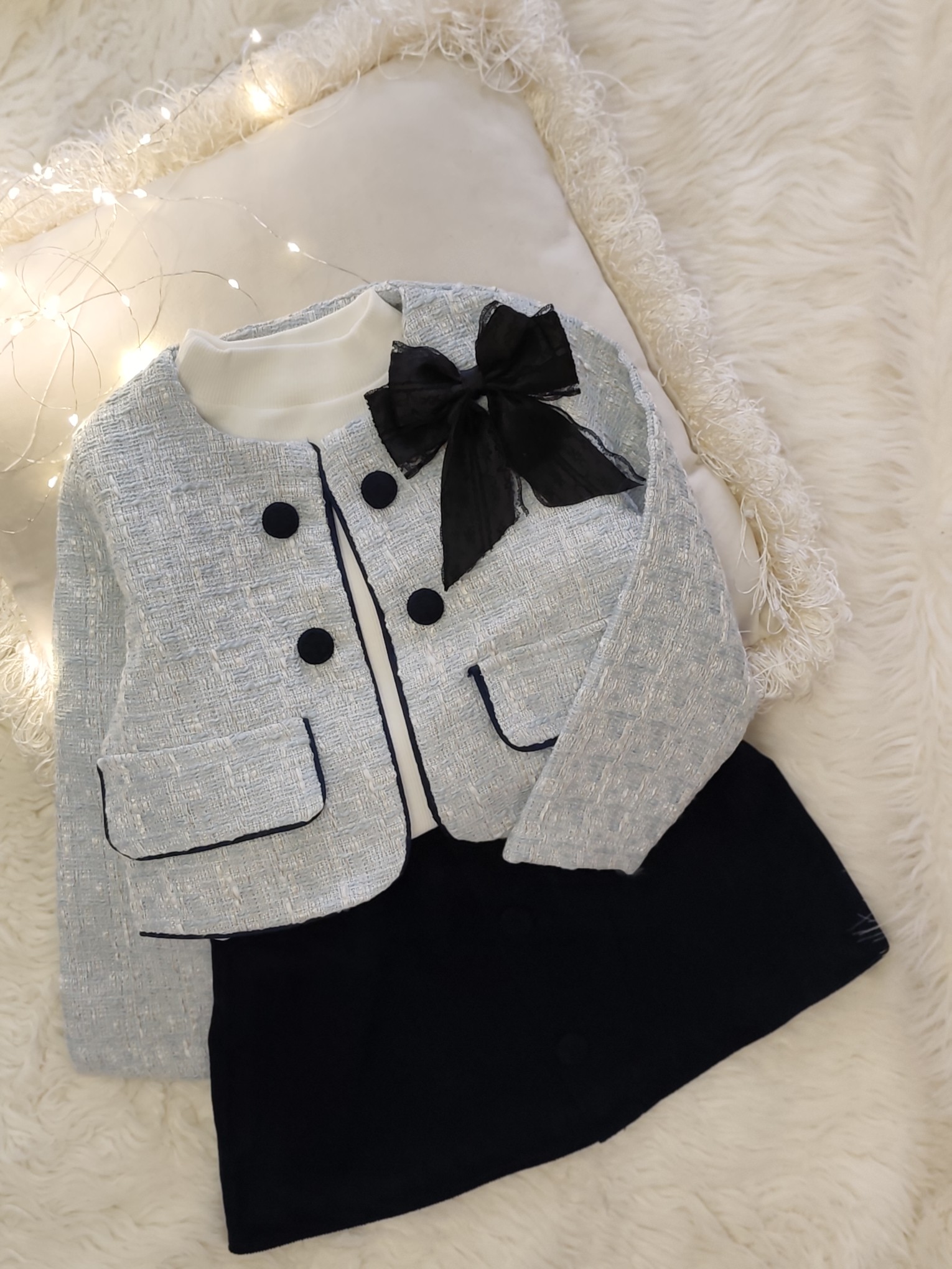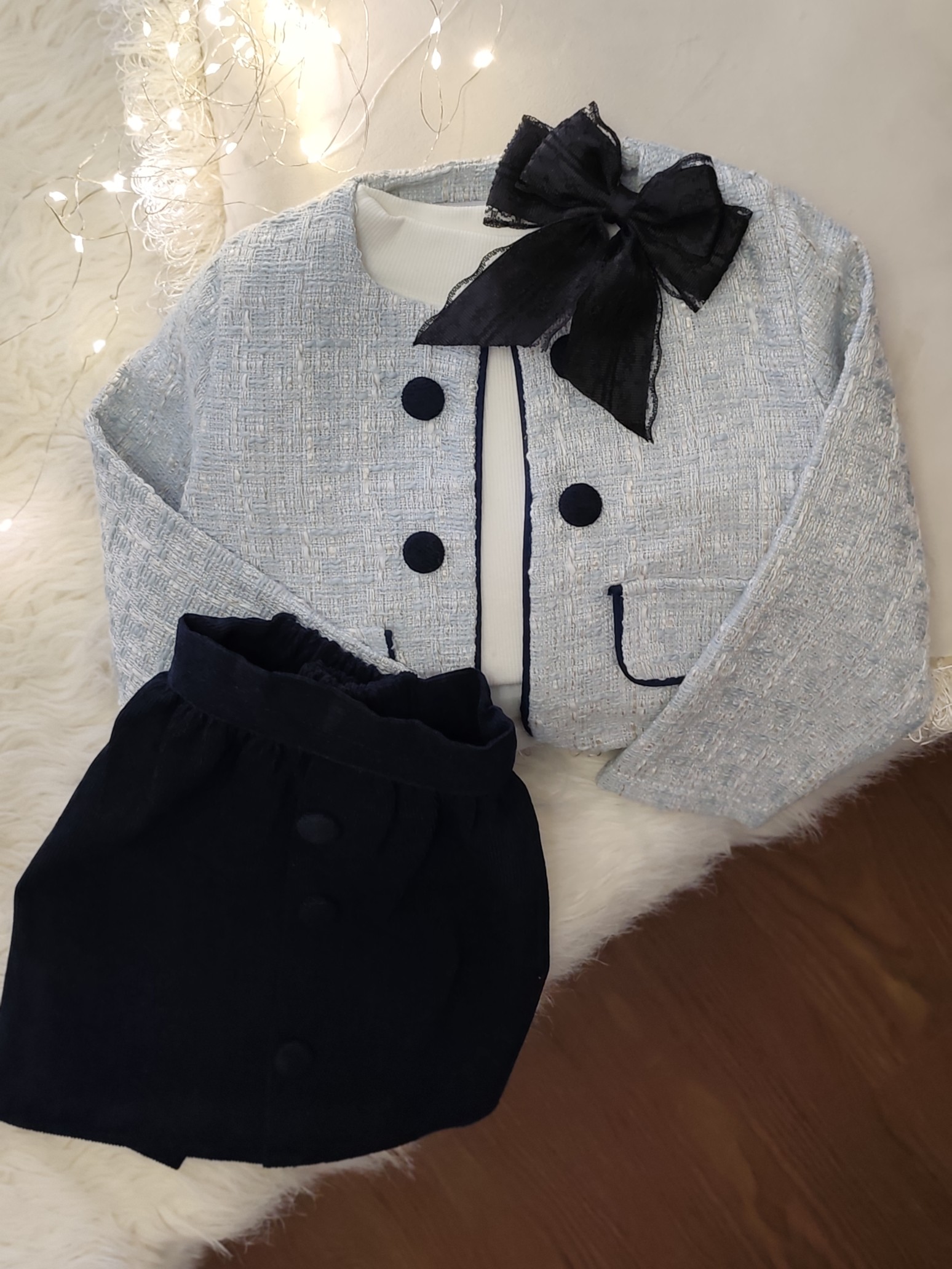 ست سه تیکه دخترانه کت پارچه شنل آستردوزی شده مغزی خارجی تاپ فان ریپ ۱۰۰ نخ پنبه دامن مخمل کبریتی ریز پشت کار ش پهن کار شده به رنگ سرمهای