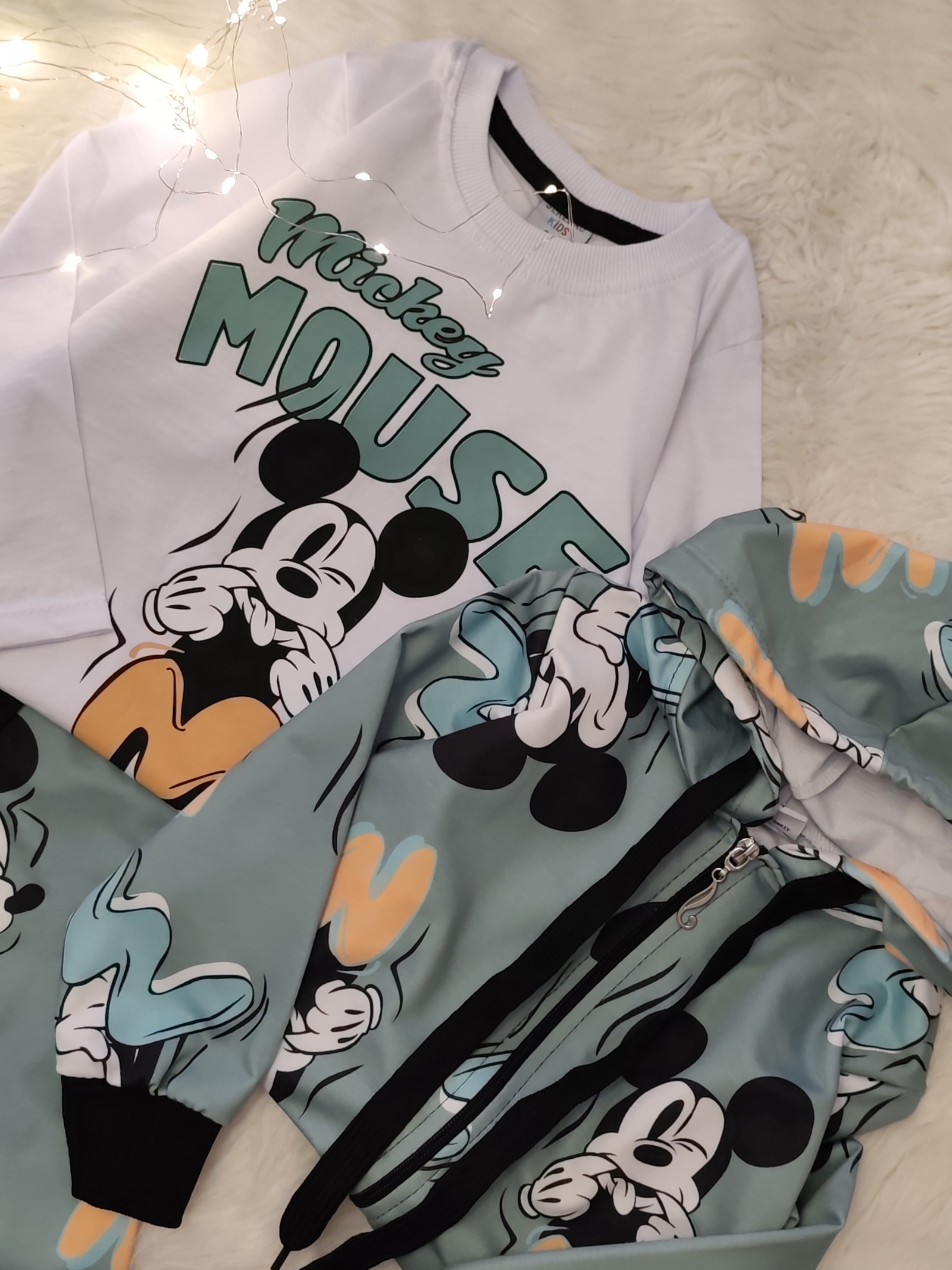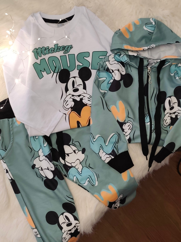 ست سه تیکه ترک سویشرت زیپدار به همراه کلاه سر خود بلیز آستین بلند با طرح جذاب میکی موس به همراه شلوار کمر که جیب میخوره و همچنین مچ پا کش محصول کشور ترکیه