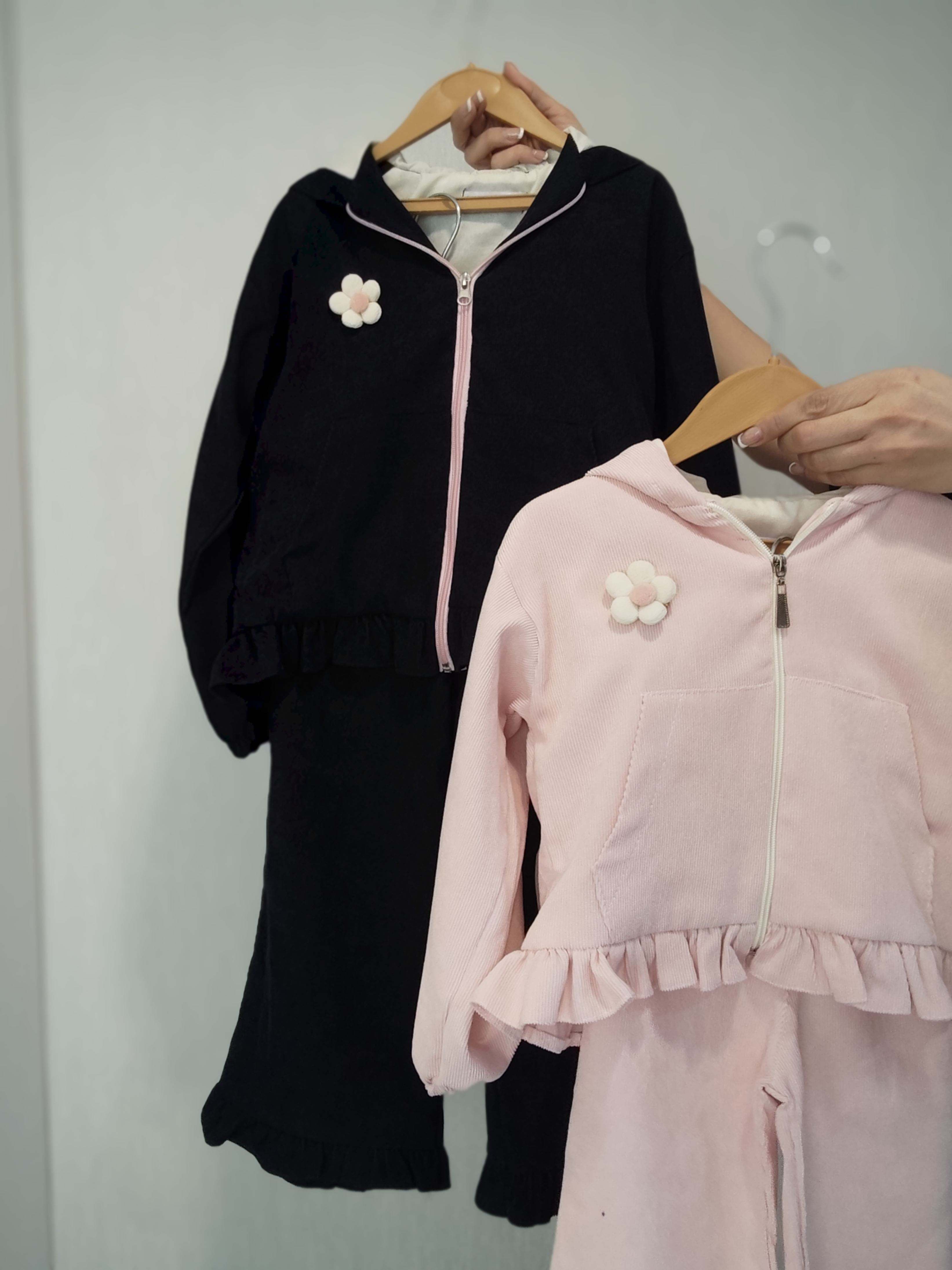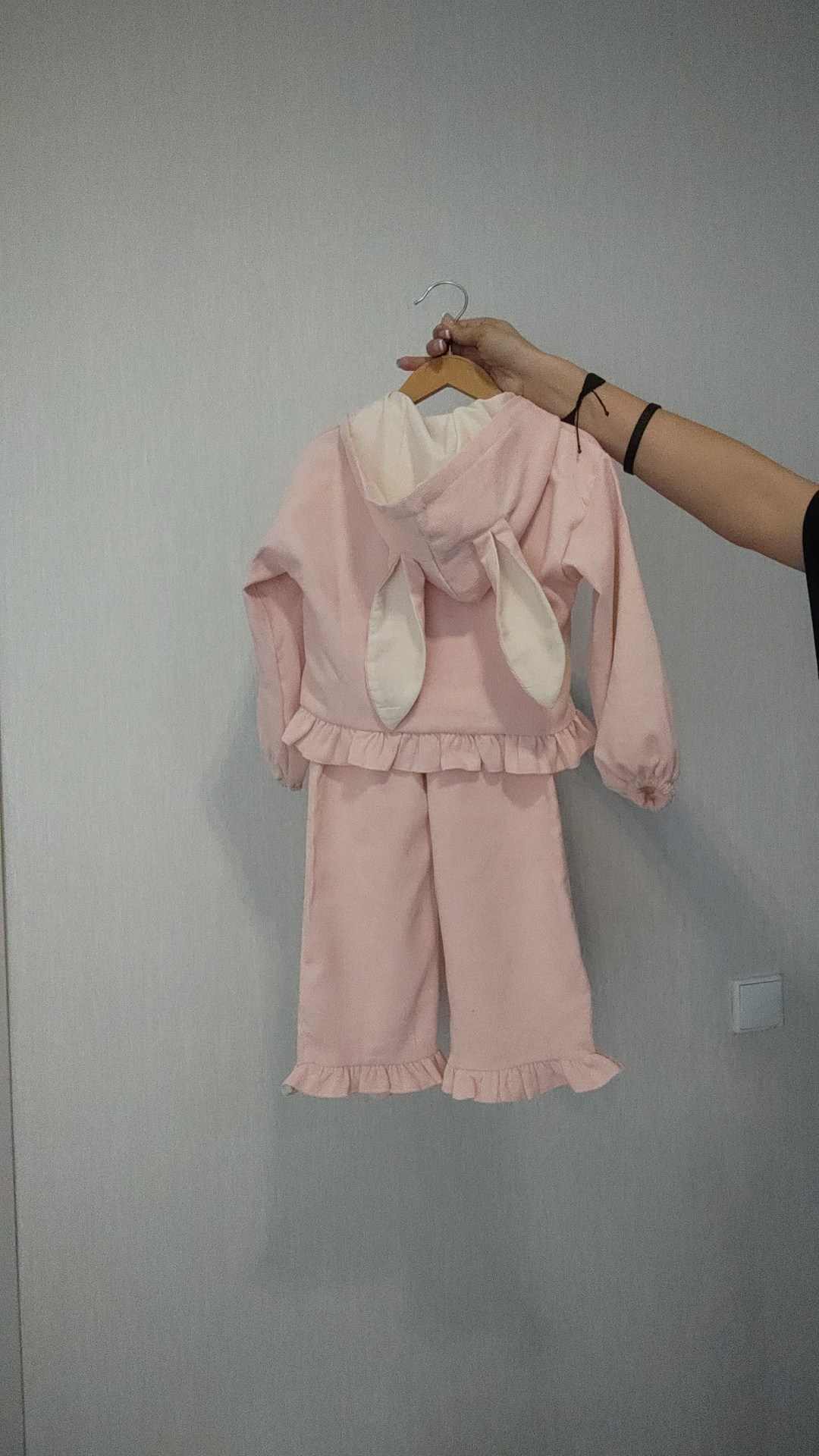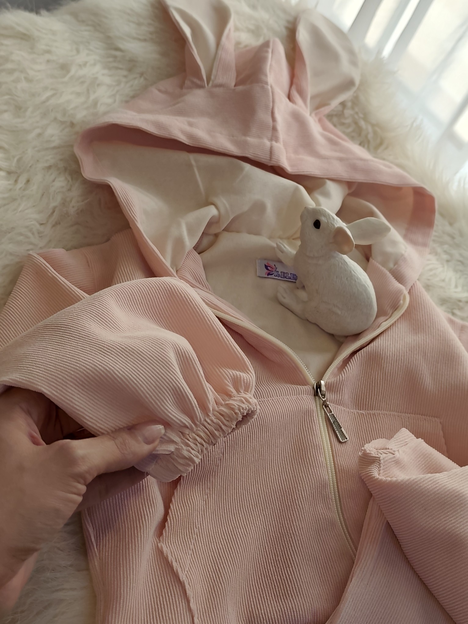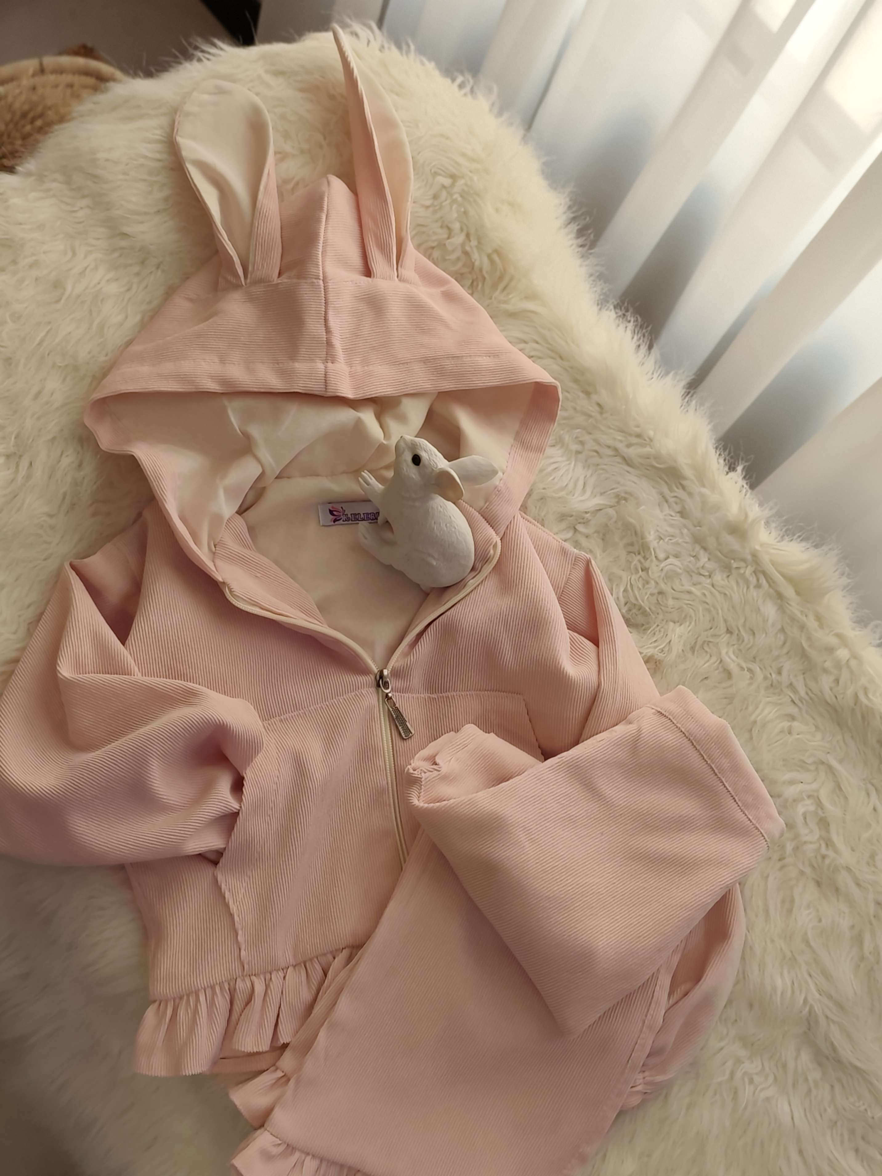 سویشرت و شلوار کبریتی ریز،کلاه سرخود خرگوشی دارد،دارای دو رنگ صورتی و سرمهای،زیپ دندون درشت،سویشرت جیب میخوره ،سر آستین کش میخوره،پایین سیشرت و همچنین پایین شلوار چیندار،شلوار کمر کش از بالا تا پایین راسته و آزار
