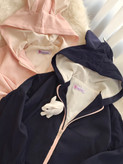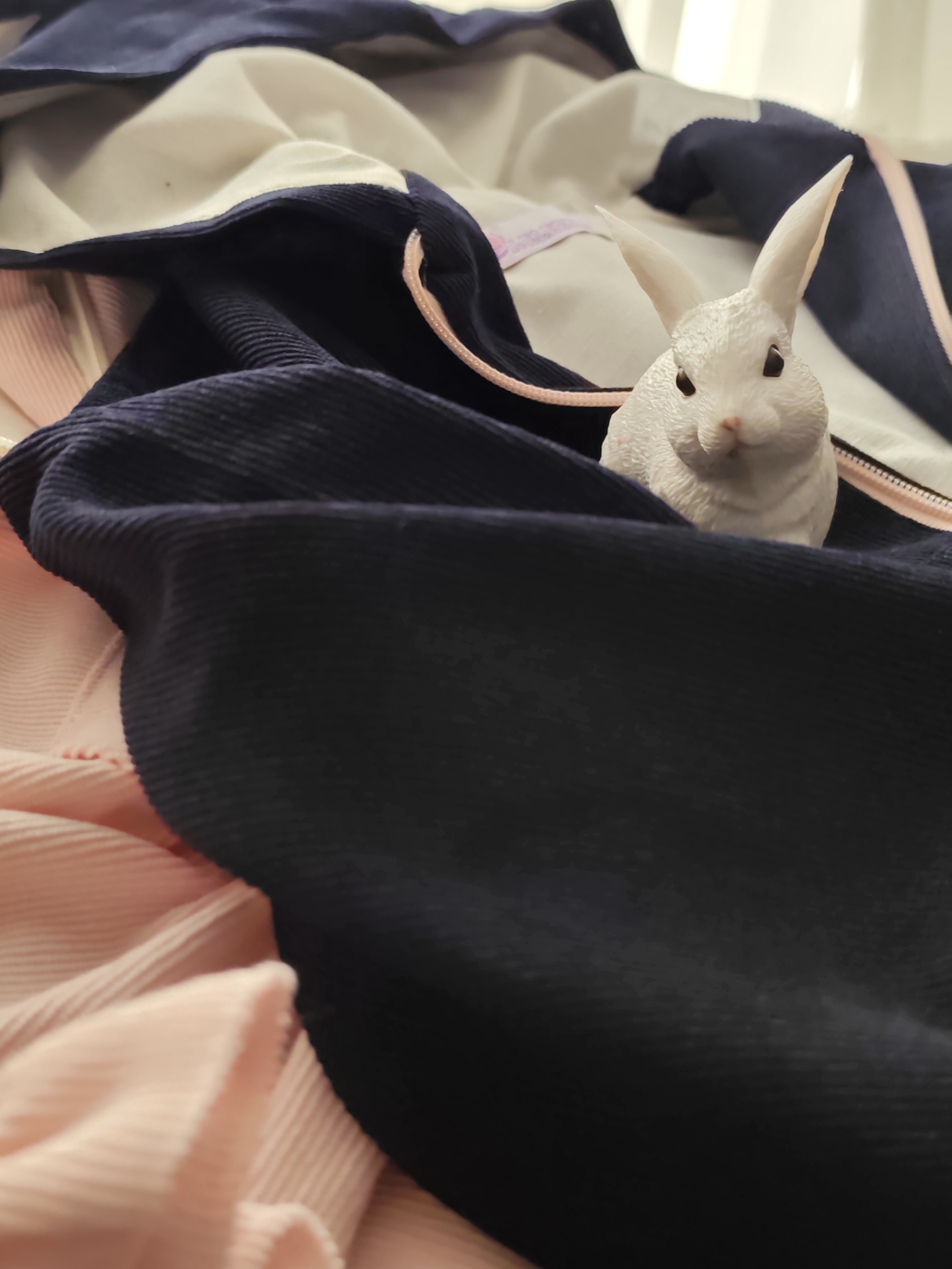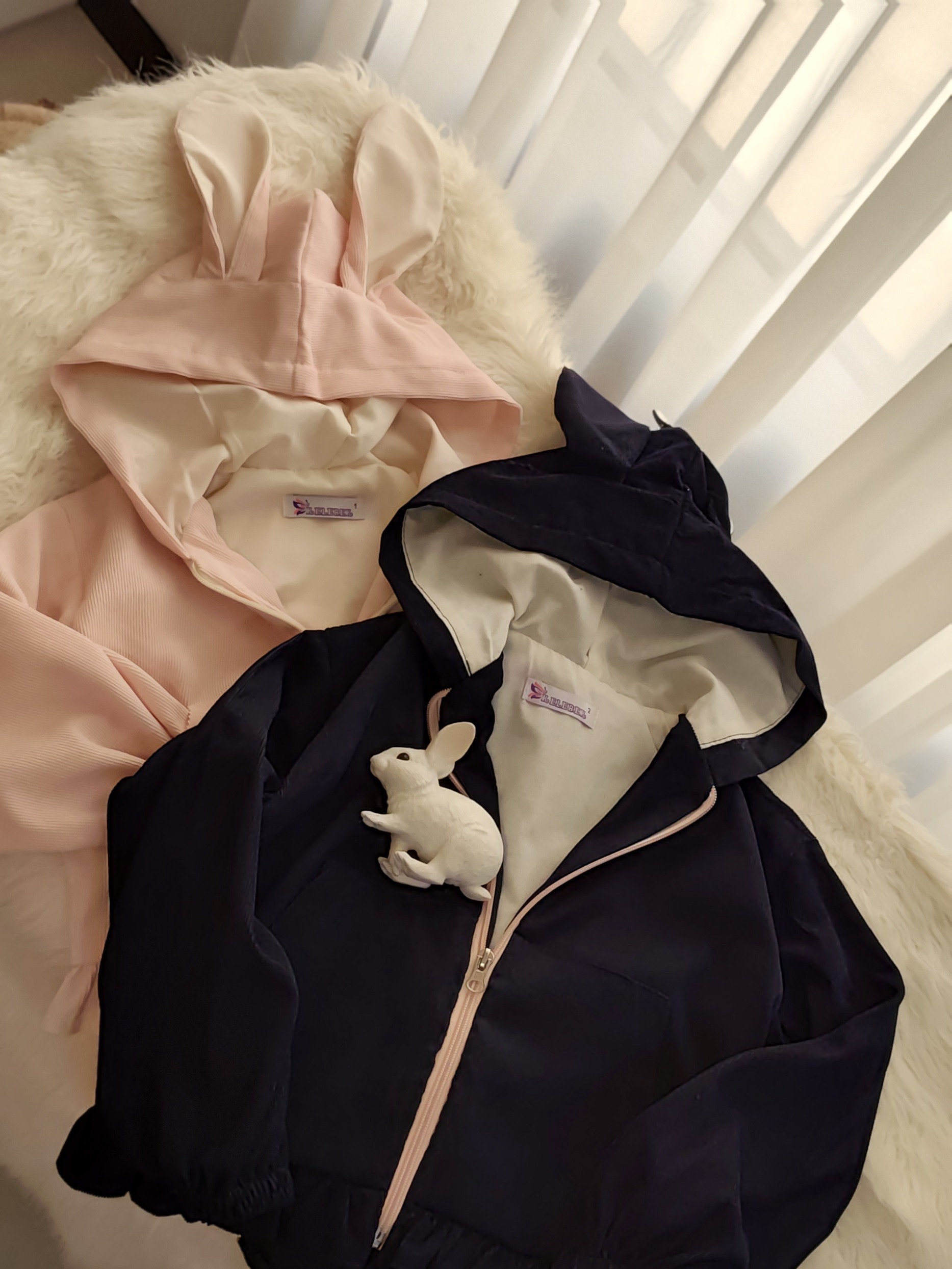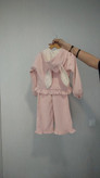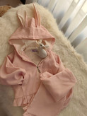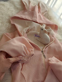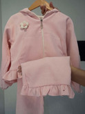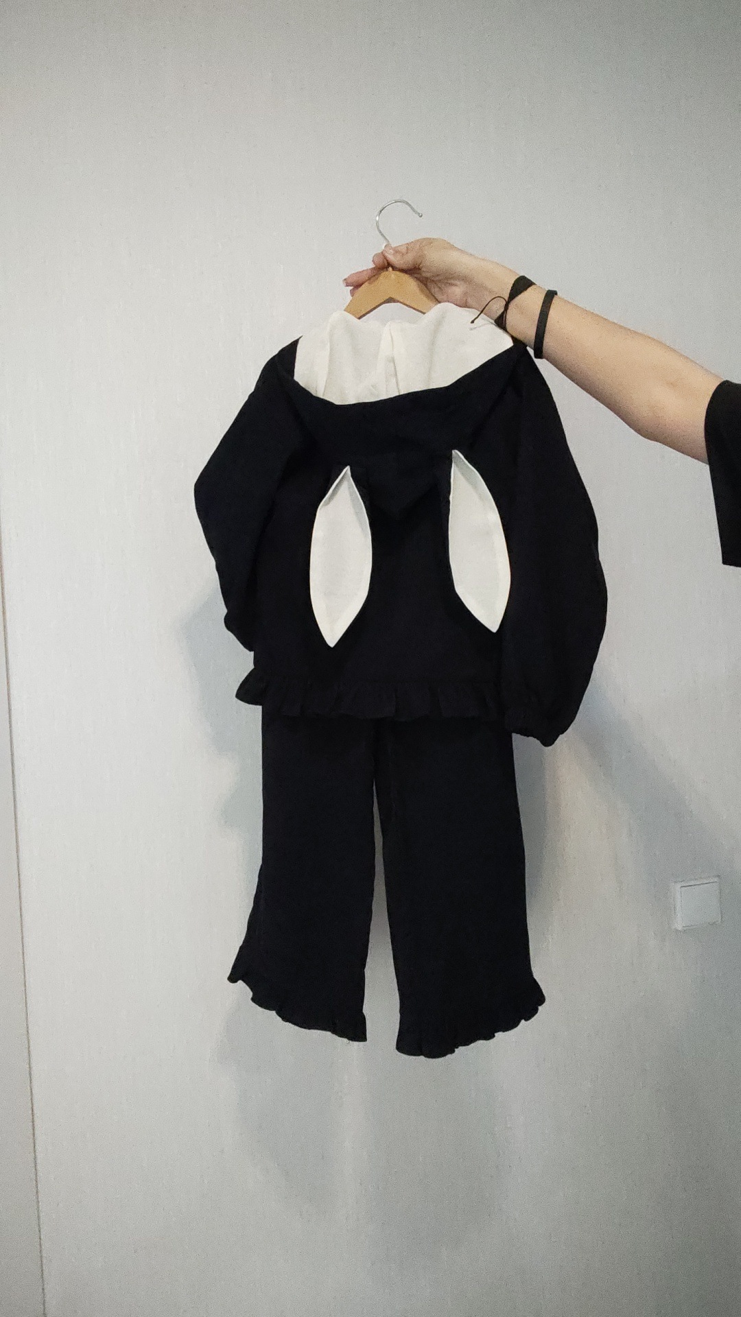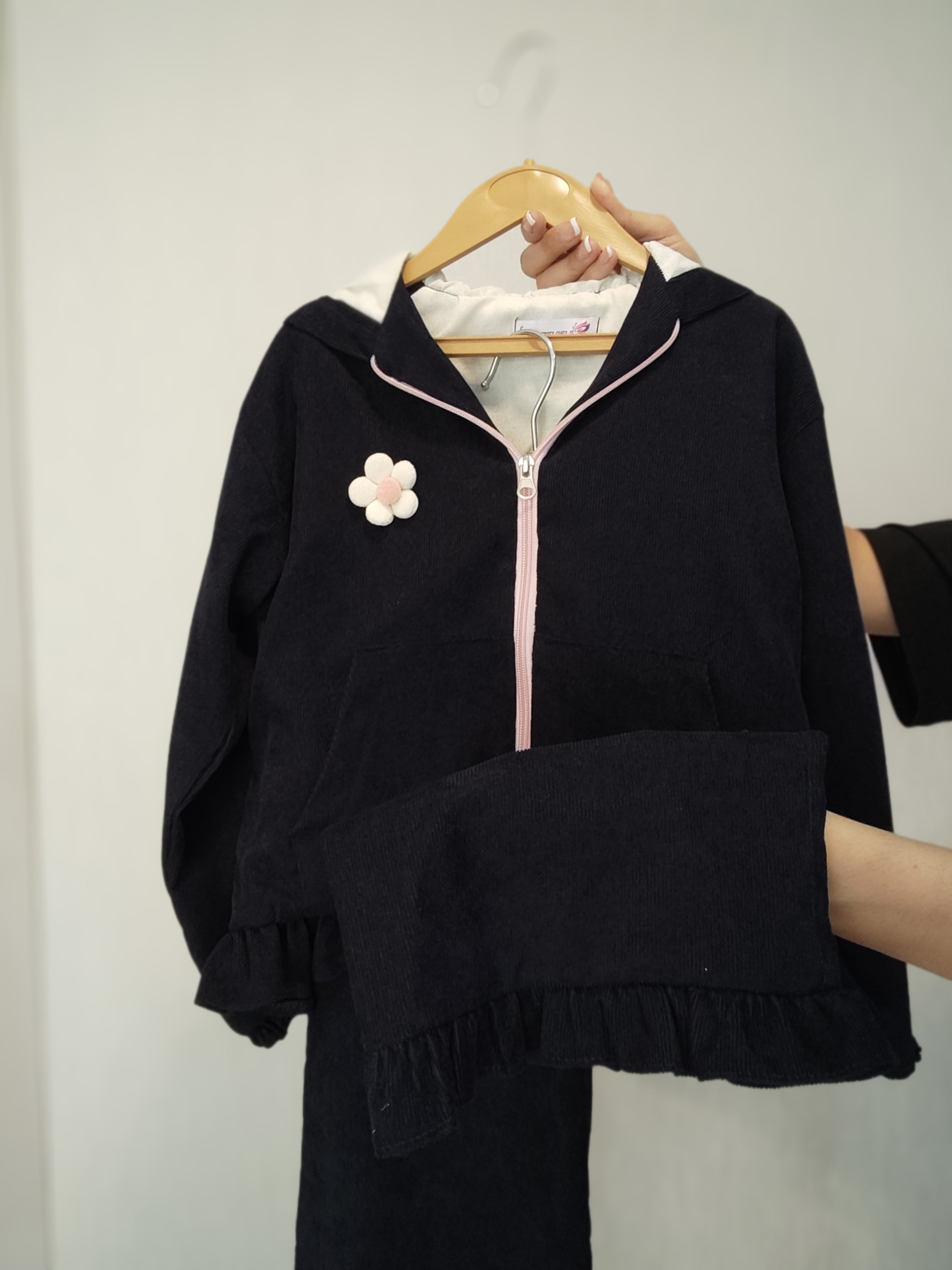 سویشرت و شلوار کبریتی ریز،کلاه سرخود خرگوشی دارد،دارای دو رنگ صورتی و سرمهای،زیپ دندون درشت،سویشرت جیب میخوره ،سر آستین کش میخوره،پایین سیشرت و همچنین پایین شلوار چیندار،شلوار کمر کش از بالا تا پایین راسته و آزار