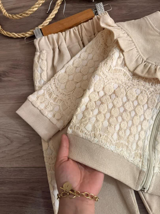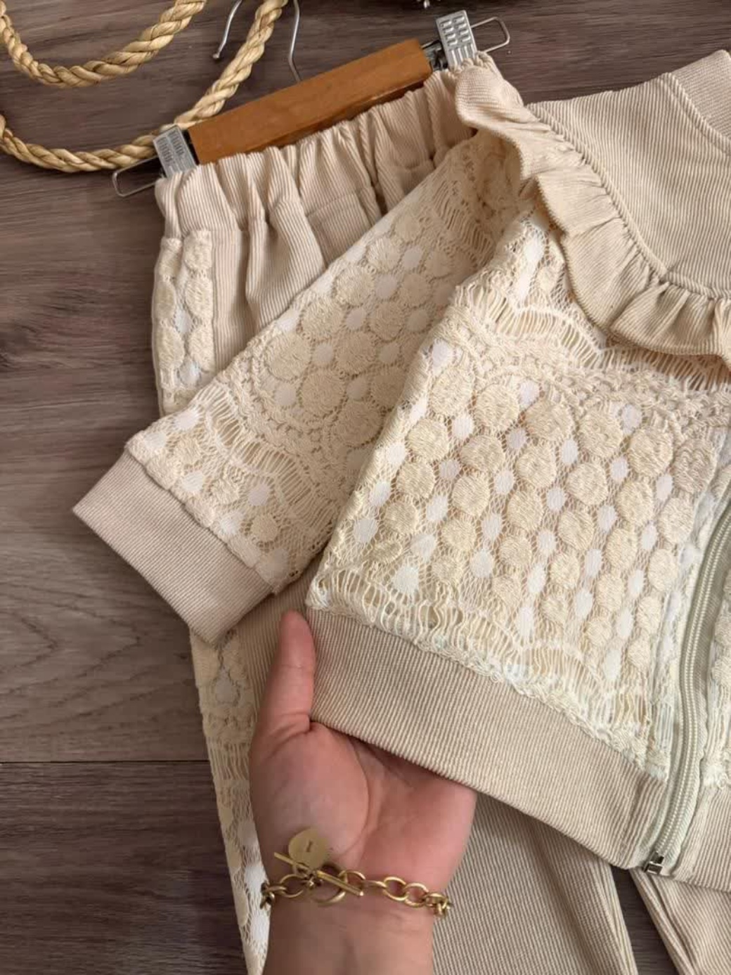 کالکشن بهاری 🌺 🌸 سوییشرت و شلوار کبریتی ریز آستر دار دخترانه بهمراه گیپور دوزی سایز 45-60